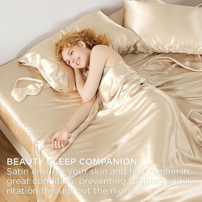Satin Sheets Queen Size Bed Set – Luxury Silky Bed Sheet Set, Ultra Soft & Wrinkle Free, Good for Hair & Skin, 15 Inches Deep Pocket for Mattress, 4-Piece (Queen, Champagne)