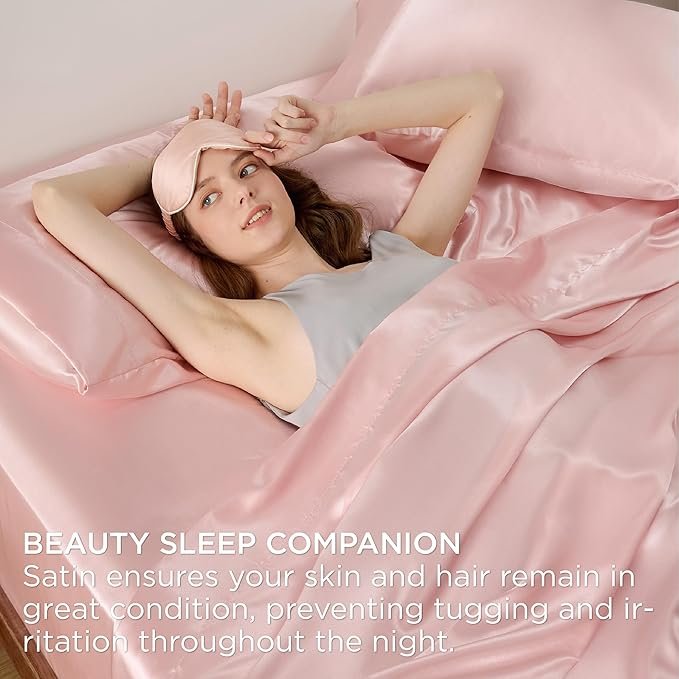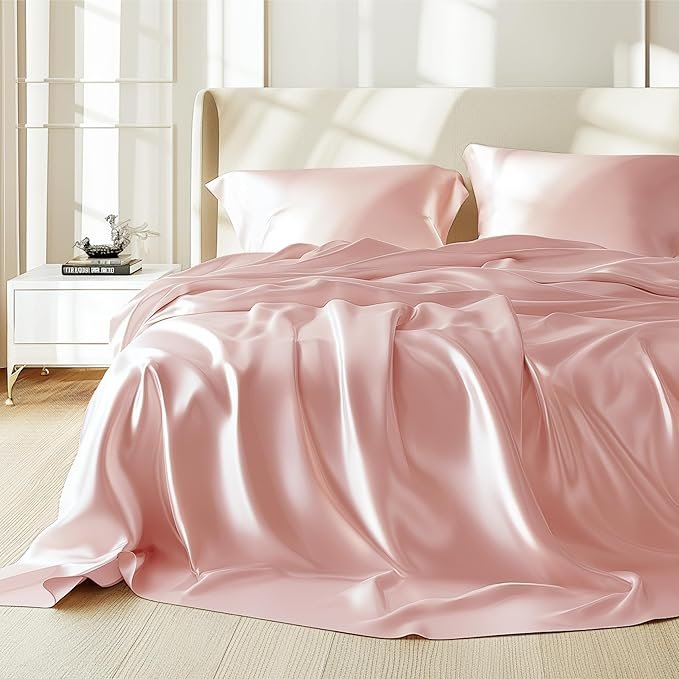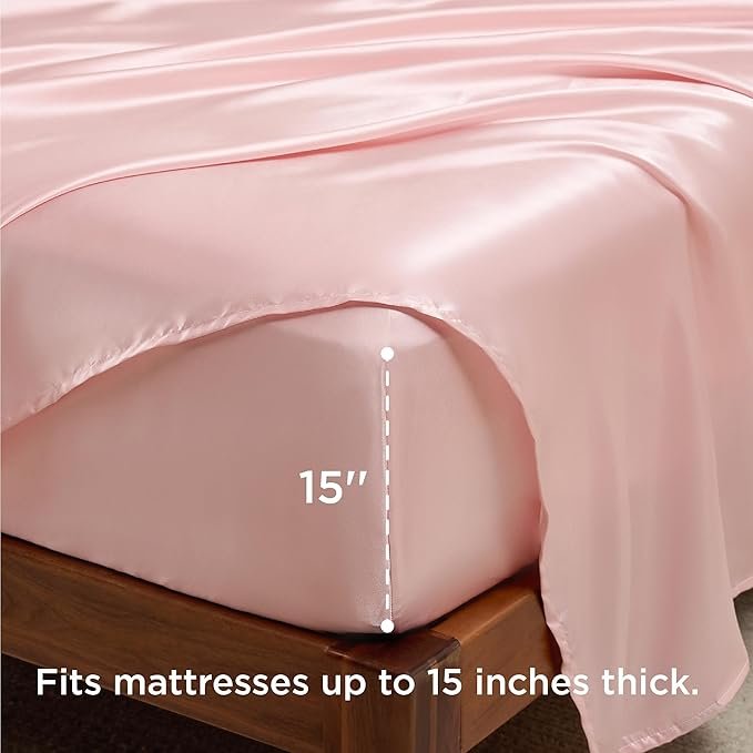 Satin Sheets Queen Size Bed Set – Luxury Silky Bed Sheet Set, Ultra Soft & Wrinkle Free, Good for Hair & Skin, 15 Inches Deep Pocket for Mattress, 4-Piece (Queen, Pink)